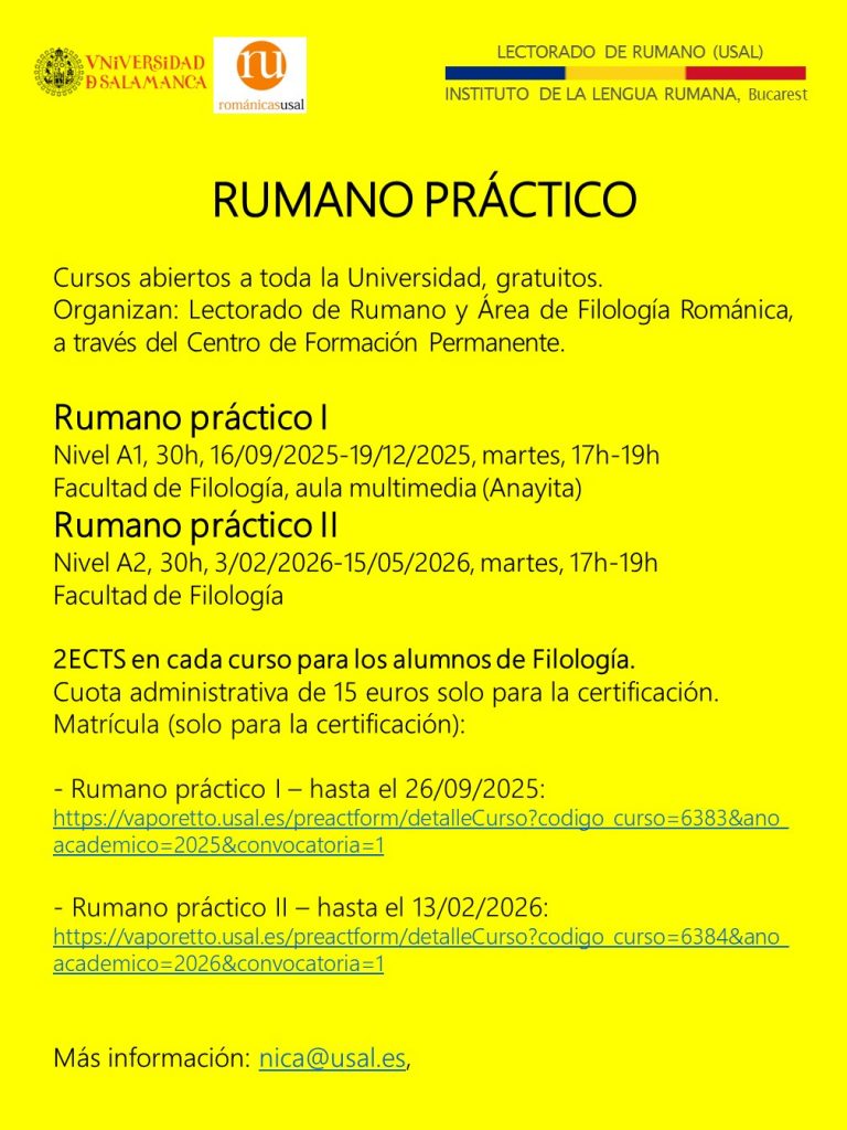 Cursos: Rumano práctico I y II Iulia Nica 25 September, 2025 Septiembre de 2025-mayo de 2026. 2+2 ECTS para los alumnos de Filología. Iulia Nica